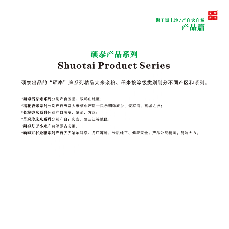 碩泰大豆雜糧及普通水稻種植基地:齊齊哈爾拜泉縣興農(nóng)鎮(zhèn)/方正縣松南鄉(xiāng)/慶安縣久勝鎮(zhèn)/肇源市新站農(nóng)場/舒蘭平安鎮(zhèn)